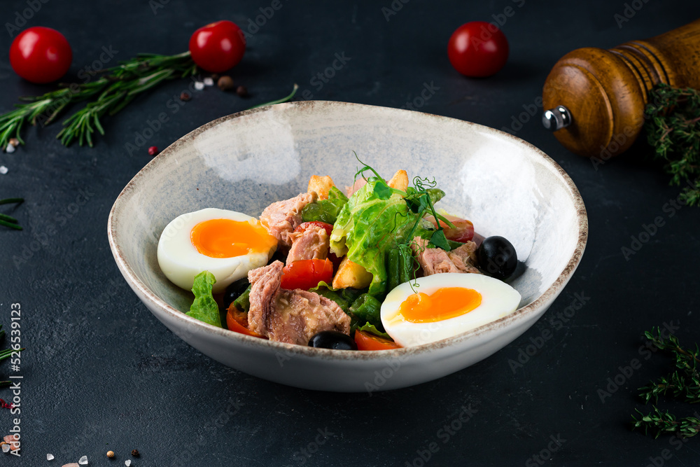 French salad Nicoise with tuna, eggs, green beans, tomatoes, olives, lettuce