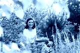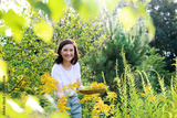 Natural medicine, a woman picks yellow goldenrod herbs in the meadow.