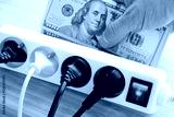 Increases in electricity prices in the United States, Energy concept, Power strip with plugs plugged in and a large bundle of dollars in hand, Increase in energy prices for households and industry