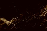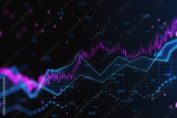 Abstract glowing candlestick forex chart with index and grid on dark background. Invest, trade, finance ans stock market concept. 3D Rendering.