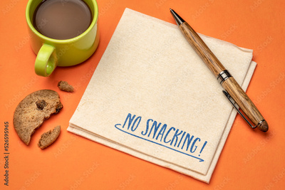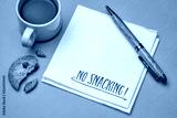 No snacking! Inspirational reminder note on a napkin with coffee and cookie. Healthy lifestyle and eating concept.