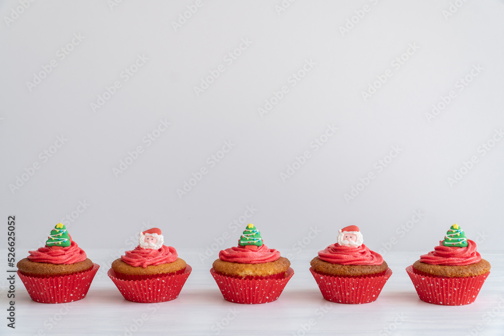 Red Christmas Cupcakes with Santa and Tree Toppers in a Line on Table with White Background and Copy Space