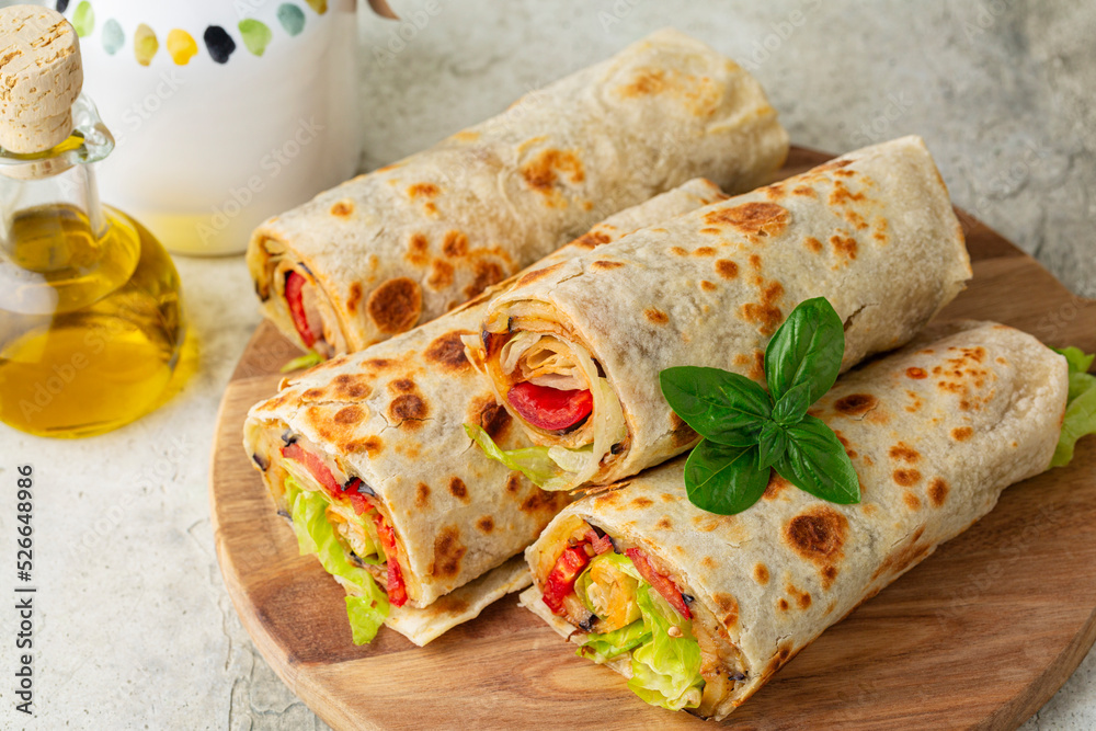 Closeup of Wraps with a soft flatbread rolled around a filling with vegetables and cheese, tomato, fried eggplant, lettuce. Vegetarian food concept.