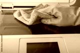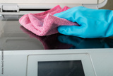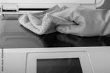 cleaning service, disinfection, hand in glove wipes dust from a printer with a rag