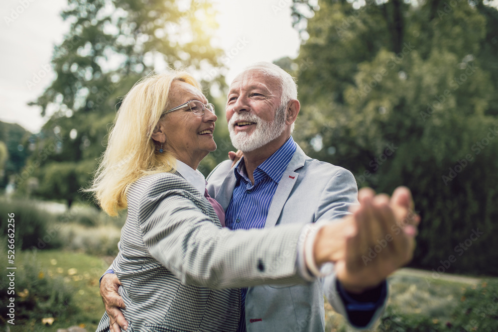 Cheerful senior couple dancing at park