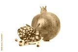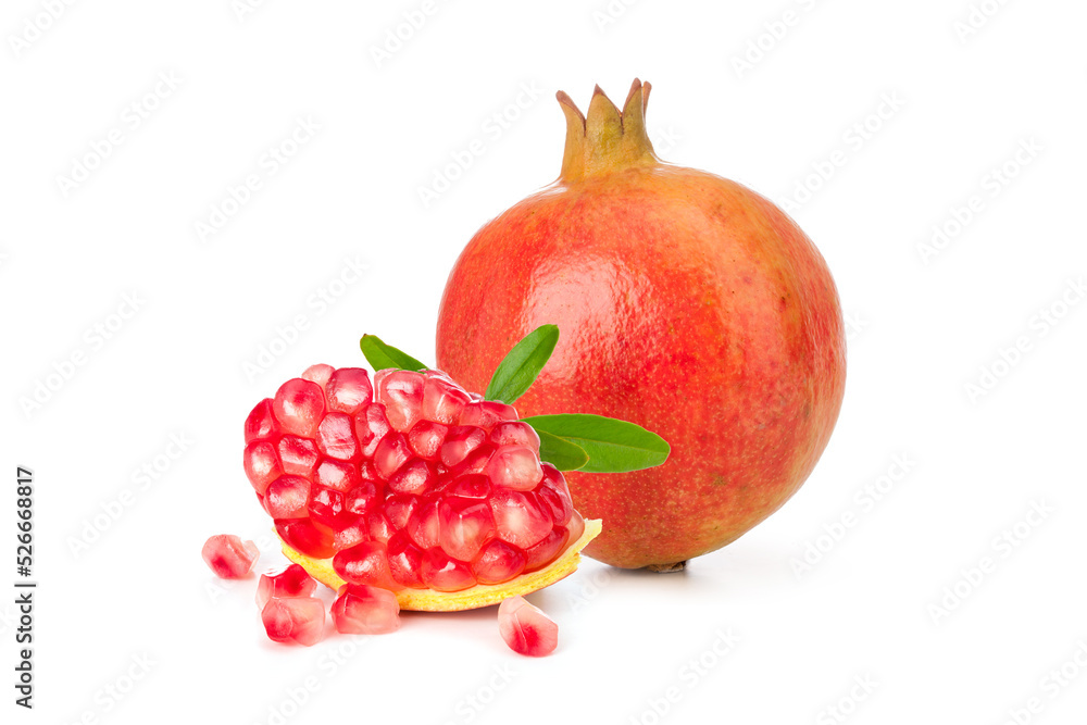 a whole pomegranate fruit with seeds and green leaves on white background.
