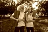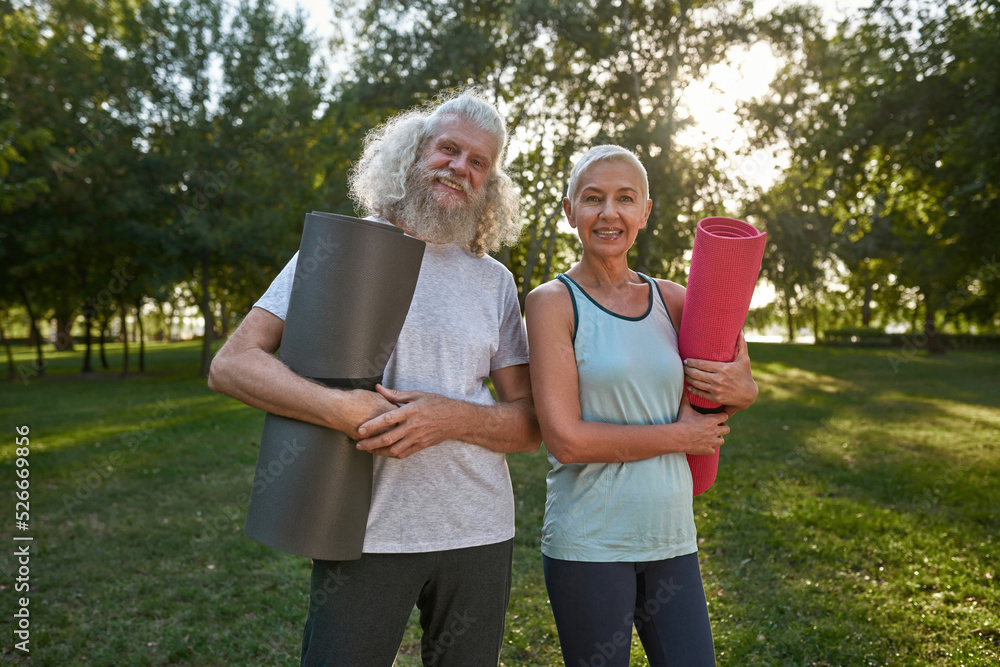 Grey hair couple with fitness mats in park