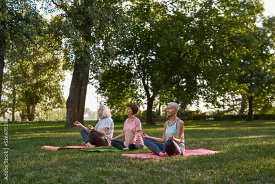Elderly caucasian friends meditating in lotus pose