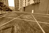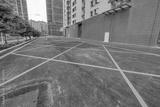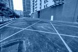Asphalt ground with crisscross yellow lines drawn outdoors