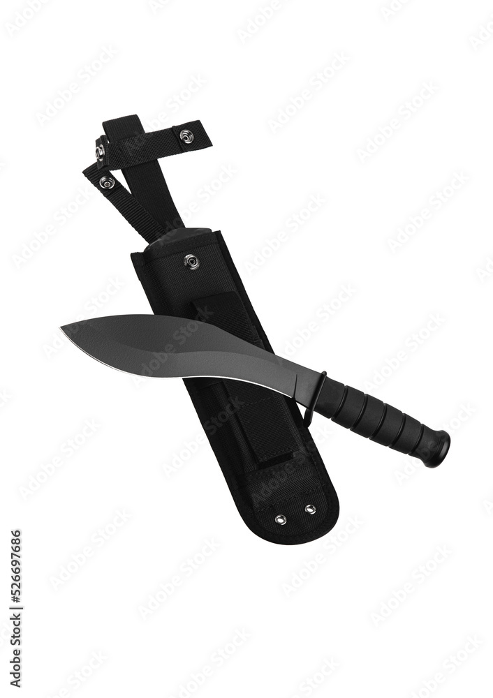 A large machete knife with a black curved blade. Modern edged weapons. Isolate on a white back.