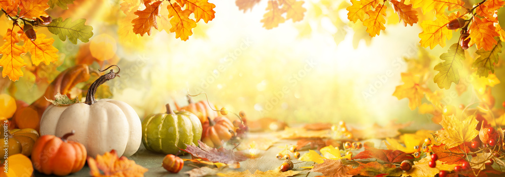 Thanksgiving or autumn scene with pumpkins, autumn leaves and berries on wooden table.