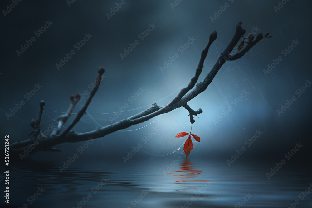 A dry lone red leaf hung on a branch above the water on a blue background. Reflection in water. The last autumn leaf on the branch, for seasonal use. Autumn street still life, blurred background.