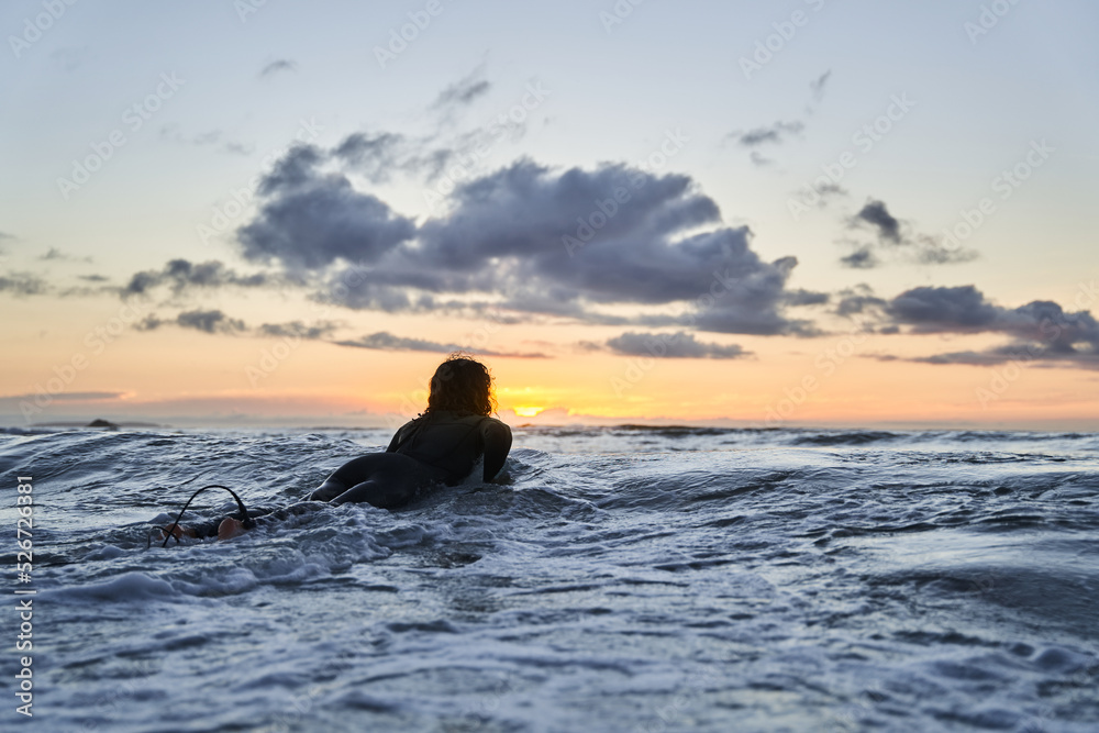 Dark shot of the female surfer wearing special wetsuit swimming at the ocean using surf board