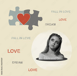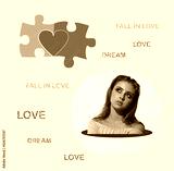 Girl dreams, love puzzles, fall in love, postcard, poster, modern collage