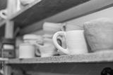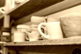 Wooden shelving in pottery workshop, which has pottery standing on shelves in pottery workshop.