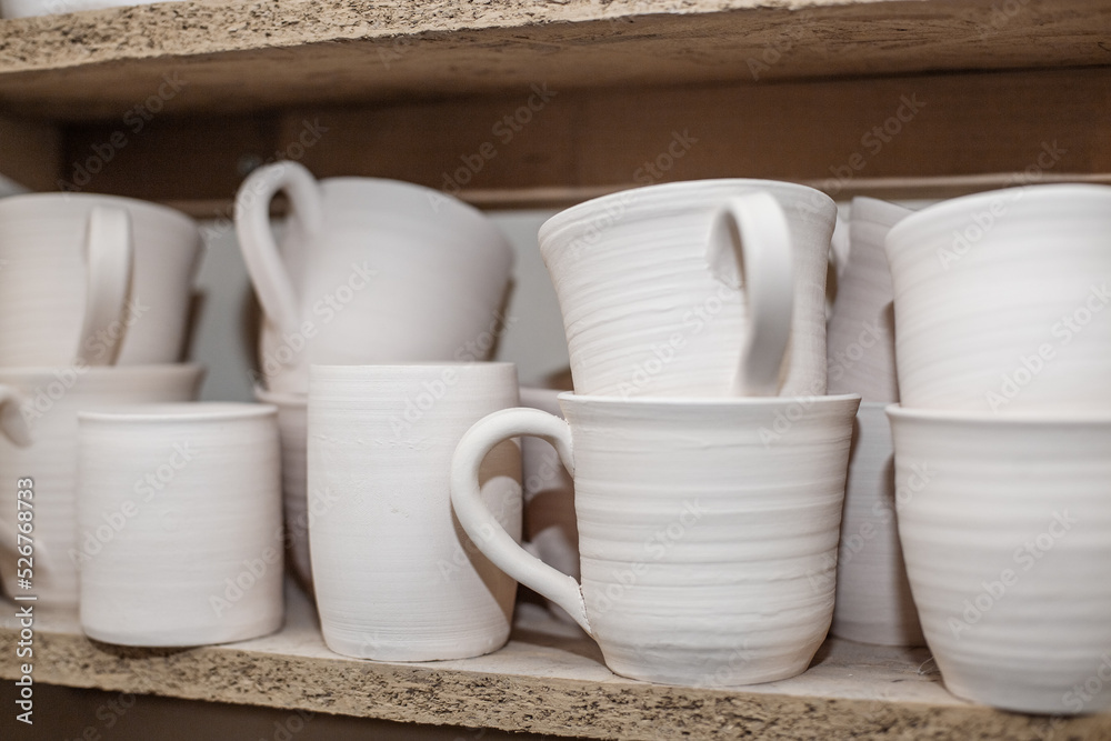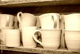 Wooden shelving in pottery workshop, which has pottery standing on shelves in pottery workshop.