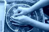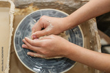 Potter girl works on potter's wheel, making ceramic pot out of clay in pottery workshop. Art concept