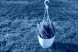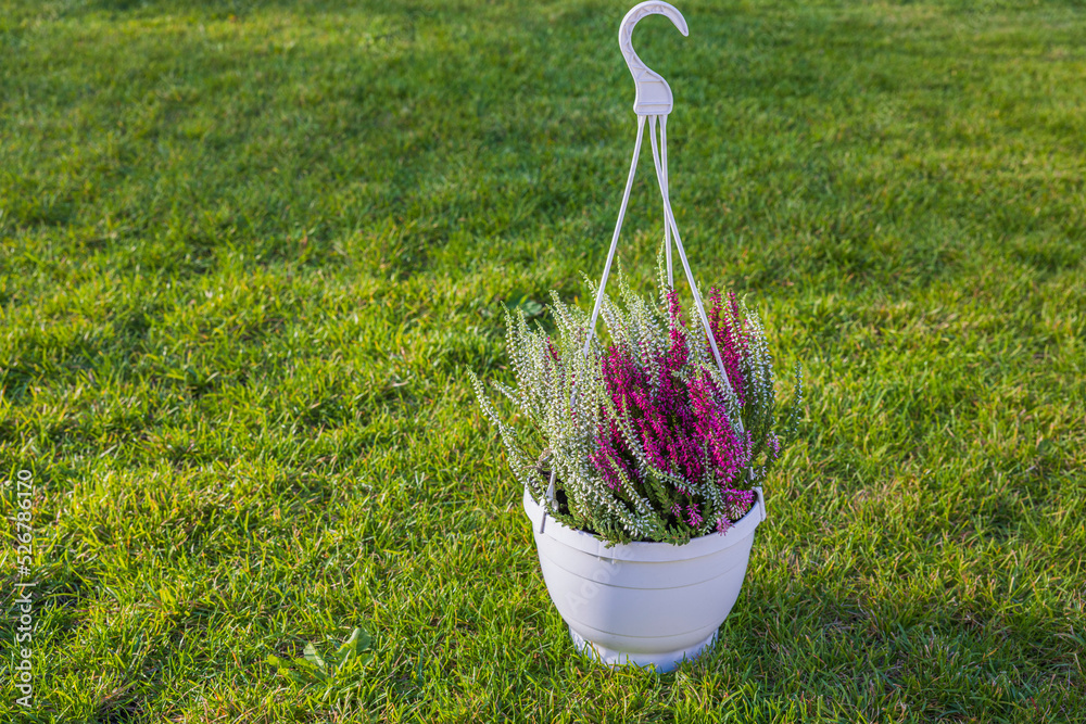 Beautiful view of Calluna vulgaris plant in white pot on green lawn.