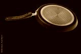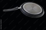 Close up view of pan for making pancakes or crepes isolated on black background.
