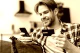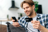 Defocused caucasian attractive stylish guy, sit on a sofa in the living room, using a bank card and a smartphone, making online purchases, making payments, ordering delivery. Online shopping, payment