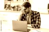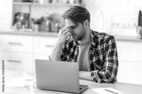 Frustrated sad caucasian man, closed eyes, massages his bridge nose, sitting at his workplace at home office in the kitchen, take break. Feeling exhausted and tired during long work in the laptop