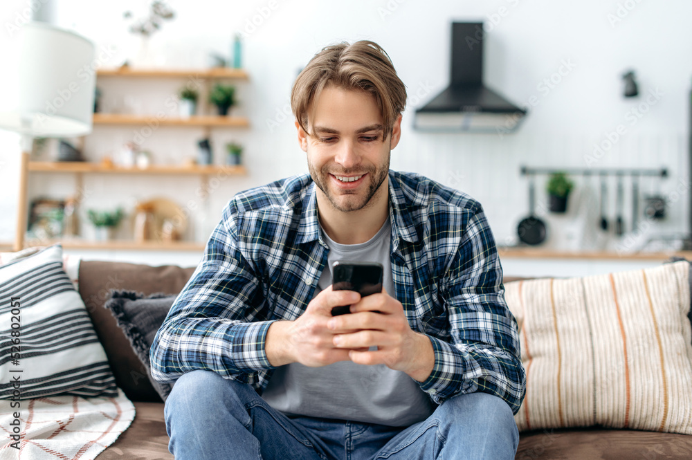 The concept of using gadgets. Attractive positive caucasian guy, sits in a modern living room on comfortable sofa, uses his smartphone, texting message, browsing social media, surfing web, smiles