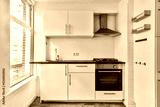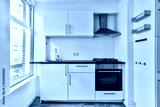 Well organized small home kitchen interior with sink under window and light furniture with stove and fridge in urban apartment