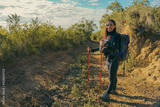 Young woman enjoying view from outlook during hike in mountains