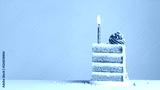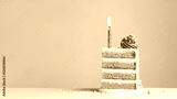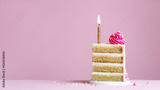 Slice of birthday cake with gold birthday cake candle and pink frosting