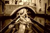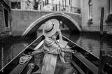 Rear, back view of elegant woman wearing straw hat on Gondola ride along beautiful street in Venice, Italy. Travel, vacation, lifestyle conception. Copy, empty space for text