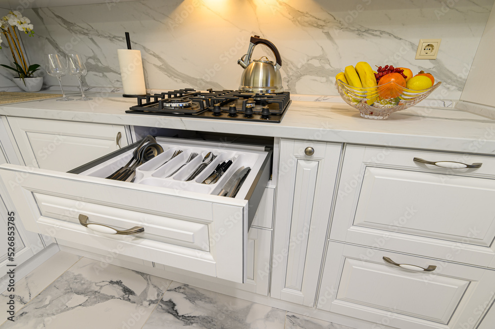 Open drawer with cutlery at modern white woden kitchen in classic style