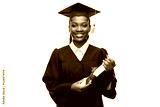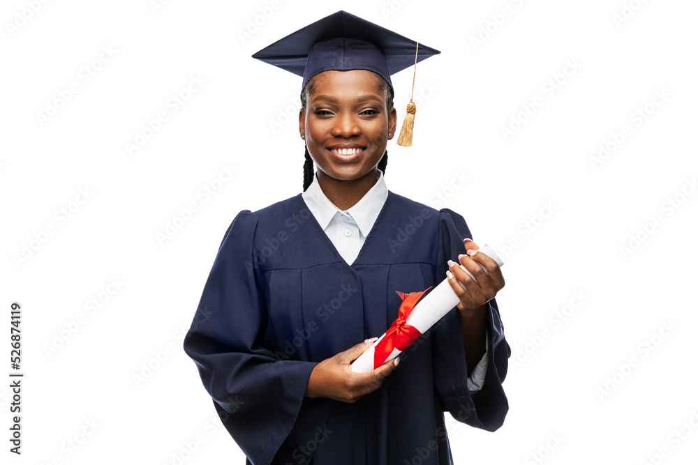 education, graduation and people concept - happy graduate student woman in mortarboard and bachelor gown with diploma