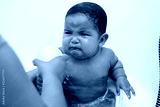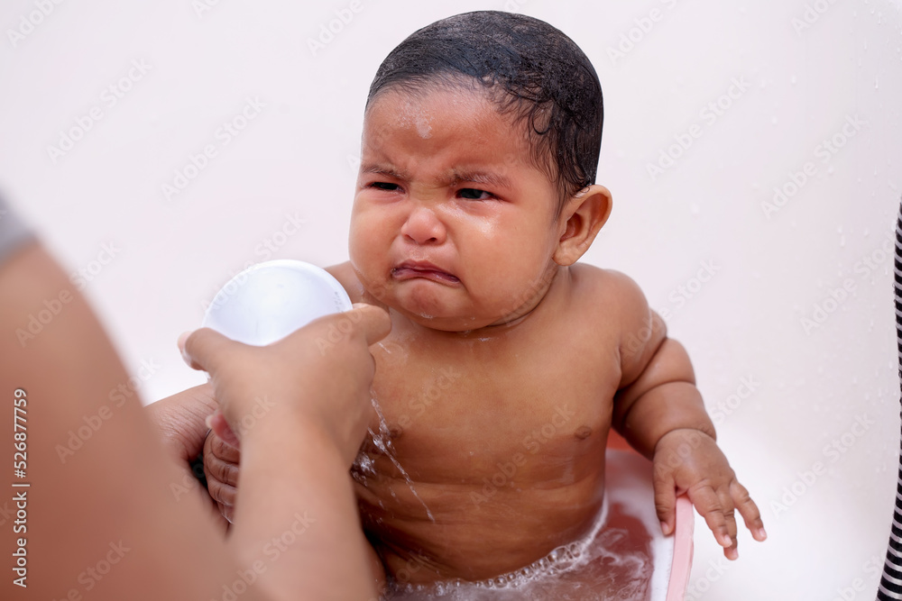 A baby crying during bath time that is upset due to water being sprayed by caregiver, to rinse the shampoo off her short hair.