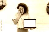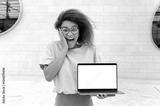 Excited shocked amazed african american young woman with curly hair, stylishly dressed, stands outdoors, holds an open laptop with blank white mock-up screen in hand, looks surprised at the camera