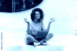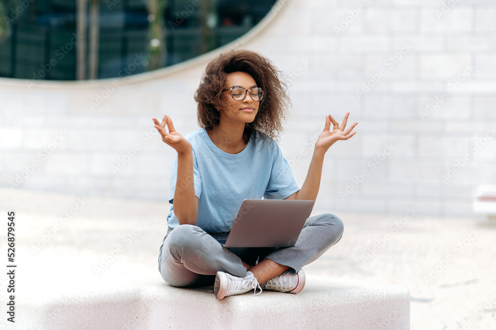 Calm relaxed curly african american young woman with glasses, office worker, sits in a lotus position outdoors near the business center, meditates, relaxes, closed her eyes. Break during online work
