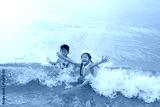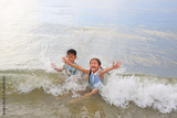 Cheerful Asian little boy and young girl child enjoy playing and lying on tropical sea beach at sunrise. Adorable sister and brother having fun in summer holiday.
