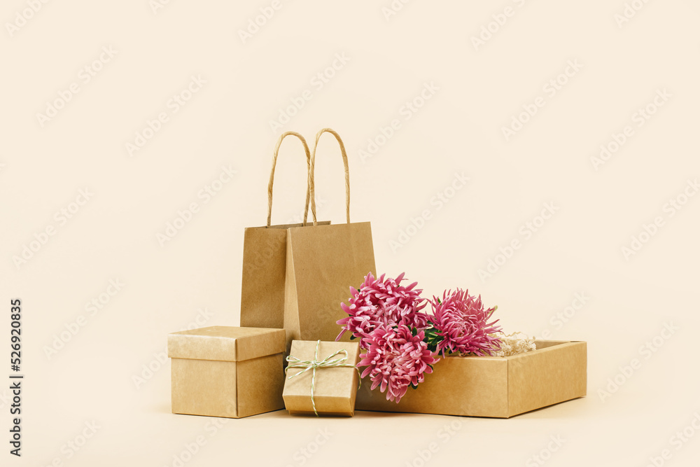 Fall Gift or Sale concept. Shopping paper bag, with aster flowers. autumn decor. Copy space. Thanksgiving. Packaging. Box delivery