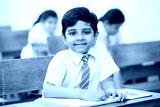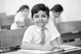 Portrait of happy indian school sitting at desk in classroom, school kids with pens and notebooks writing test Elementary school, Education concept.