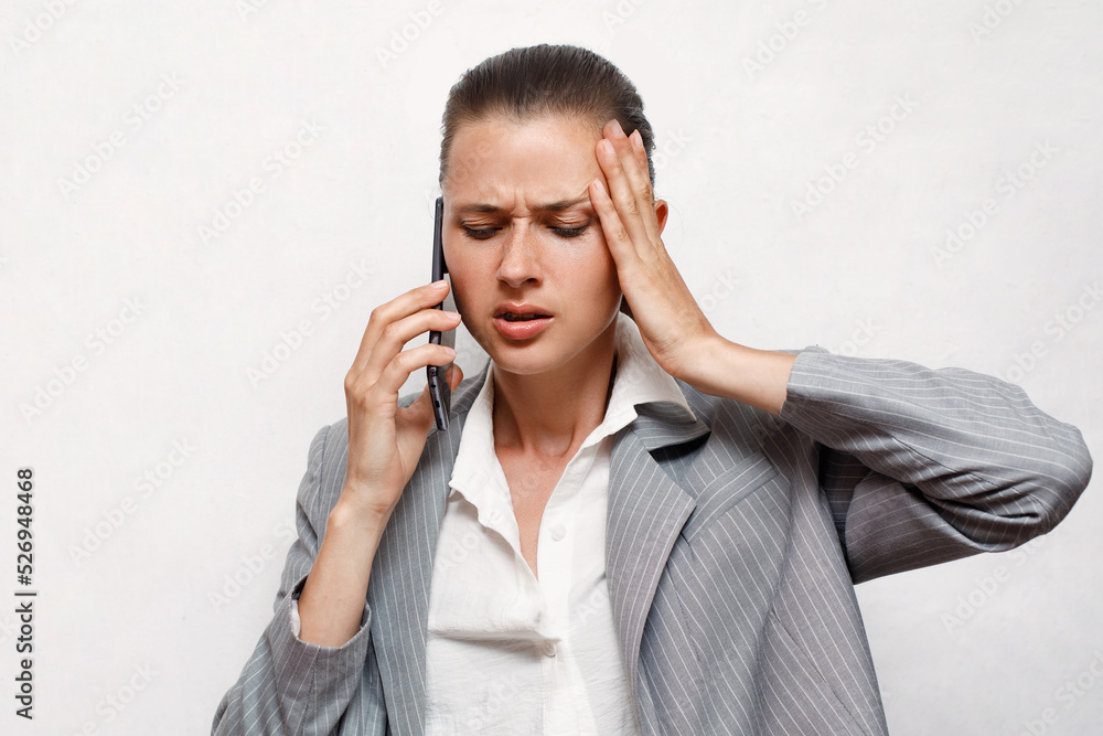 Woman in business suit talking on the phone with irritation and anxiety with headache, business deadlines and health