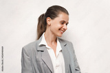 Caucasian Girl in business style laughs showing her teeth, emotional confident female