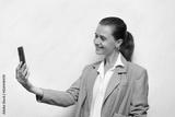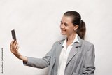 Successful female manager in a business suit is talking on a video link with a sincere smile, white background, communication