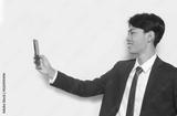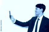 young businessman wearing suit, blue shirt with tie using cellphone standing in studio