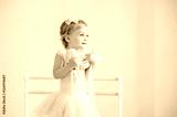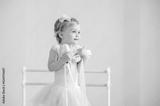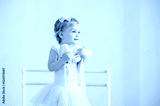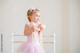 Portrait of a cute blue-eyed baby ballerina in pink hugging pointe shoes.