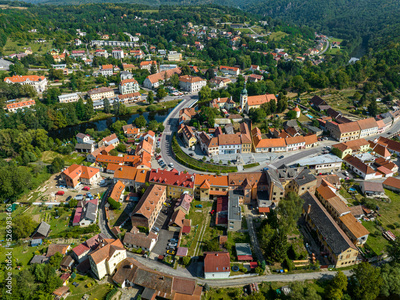 Czechia. Vranov nad Dyji Aerial View. Baroque castle and city in Moravian region in Czech Republic. Dyje river. Vranov nad Dyjí Chateau. Czechia.