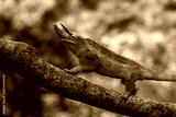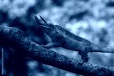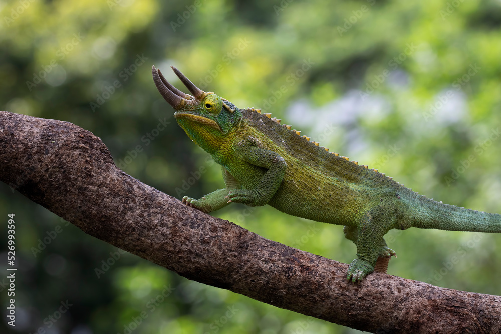 Jackson's chameleon (Trioceros jacksonii) is climbing on tree branch.