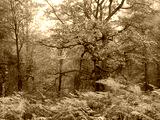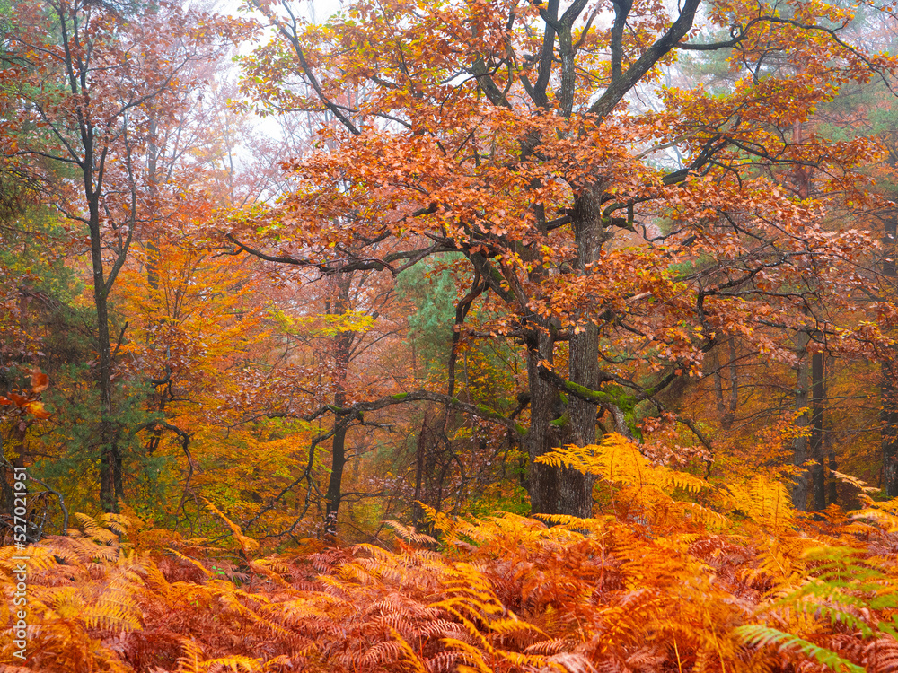 Forest leafage glowing in warm vibrant shades of autumn season in foggy forest