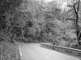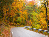Moist winding asphalt road in the embrace of lush and colorful autumn forest