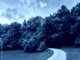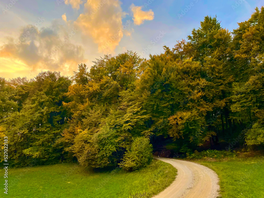 Gravel path leading towards forest in beautiful autumn shades at sunset light