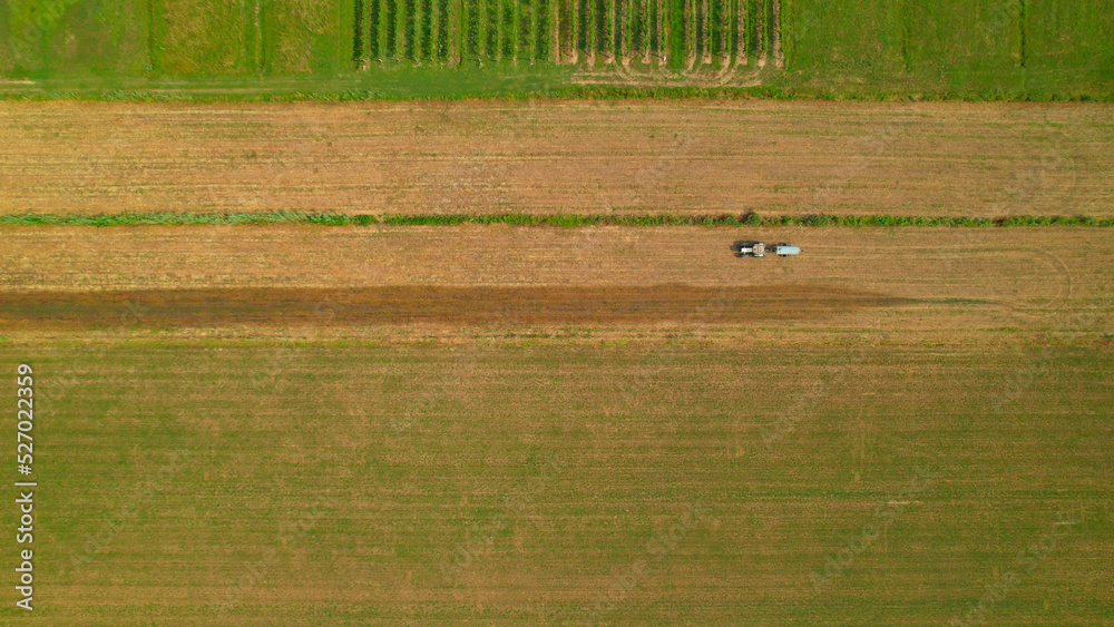 AERIAL, TOP DOWN: Tractor finished with spreading manure on field in fall season