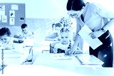 Nice pupils are listening carefully to their tutor. Primary school kids sitting on desks and working in classroom. Female teacher help cute little schoolgirl during lesson.